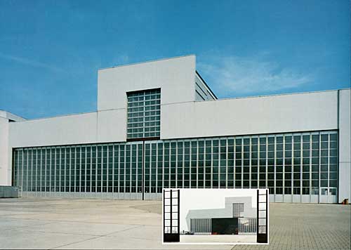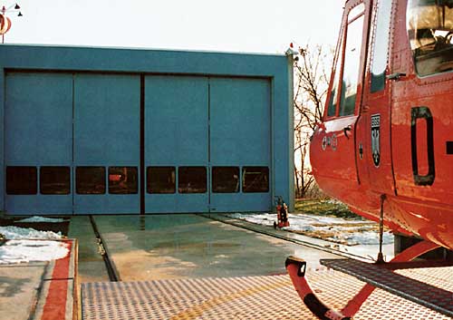The telescopic hangar doors are constructed true to the measure of each type of hangar hall. There is no standard but in any way we can find a solution for every conceivable hangar situation. For this reason, our enterprise builds these doors in steel and aluminium from a height of 3,800 mm up to a height of 23,000 mm. As a consequence of this situation, it is impossible to publish a standard description of these doors, so that the pictures have become a more expressive means of explanation.