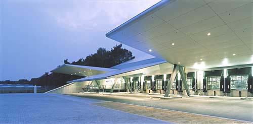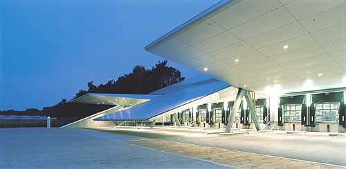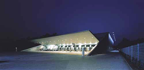 - Abschluss/Verschluss: Tor schliesst nahtlos an Dachkonstruktion an und wird damit zum Teil des Daches. Ein Schwerlastgitter im unteren Bereich schützt das zum Dach gewandelte Tor vor unbefugtem Zutritt. Das Schwerlastgitter wird im geöffnetem Zustand des Tores zum Überfahrgitter.