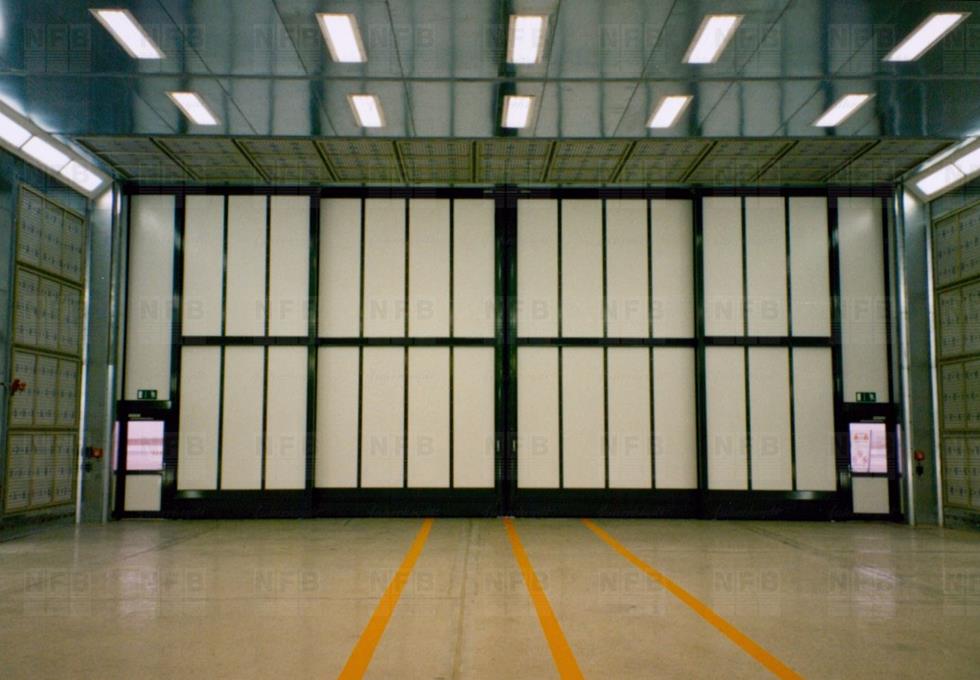 Die Tore bewegen sich in vier Segmenten übereinanderschiebend, mittig geteilt, zur linken und zur rechten Seite. Das Tor ist doppelwandig ausgeführt als isolierte Einheit und abgeschlossen mit doppelten Neopren-Dichtungen, um den Auslass von Farbnebel zu vermeiden. Das Tor wurde gemäss Kundenvorgabe so konstruiert, dass Demontage und Wiederaufbau jederzeit möglich sind.