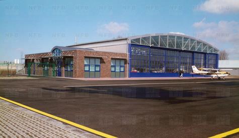Vollflächig verglaste Teleskop-Schiebetore in Hangartor-Ausführung mit den Maßen 50 x 5,6 m bzw. 30 x 5,6 m als Gebäudeabschluss für eine Hangar-Werfthalle.
